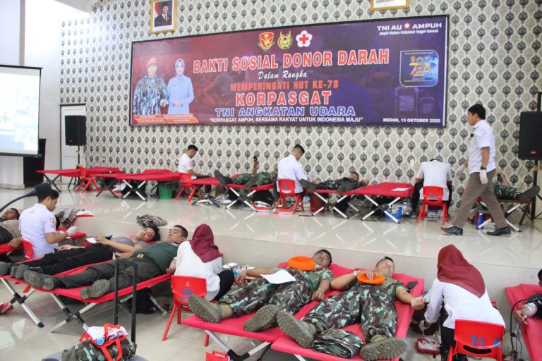 Pen Pancawara – Dalam rangka menyambut Hut Ke-78 Korpasgat, Korpasgat di Medan menggelar kegiatan donor darah yang dilaksanakan di Aula G.Siahaan Batalyon Komando 469 Korpasgat, Medan. Senin (13/10/2025)